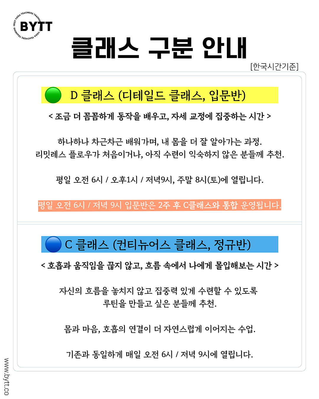: 평일 오전 6시 / 저녁9시 입문반은 2주 후 C클래스와 통합 운영됩니다.