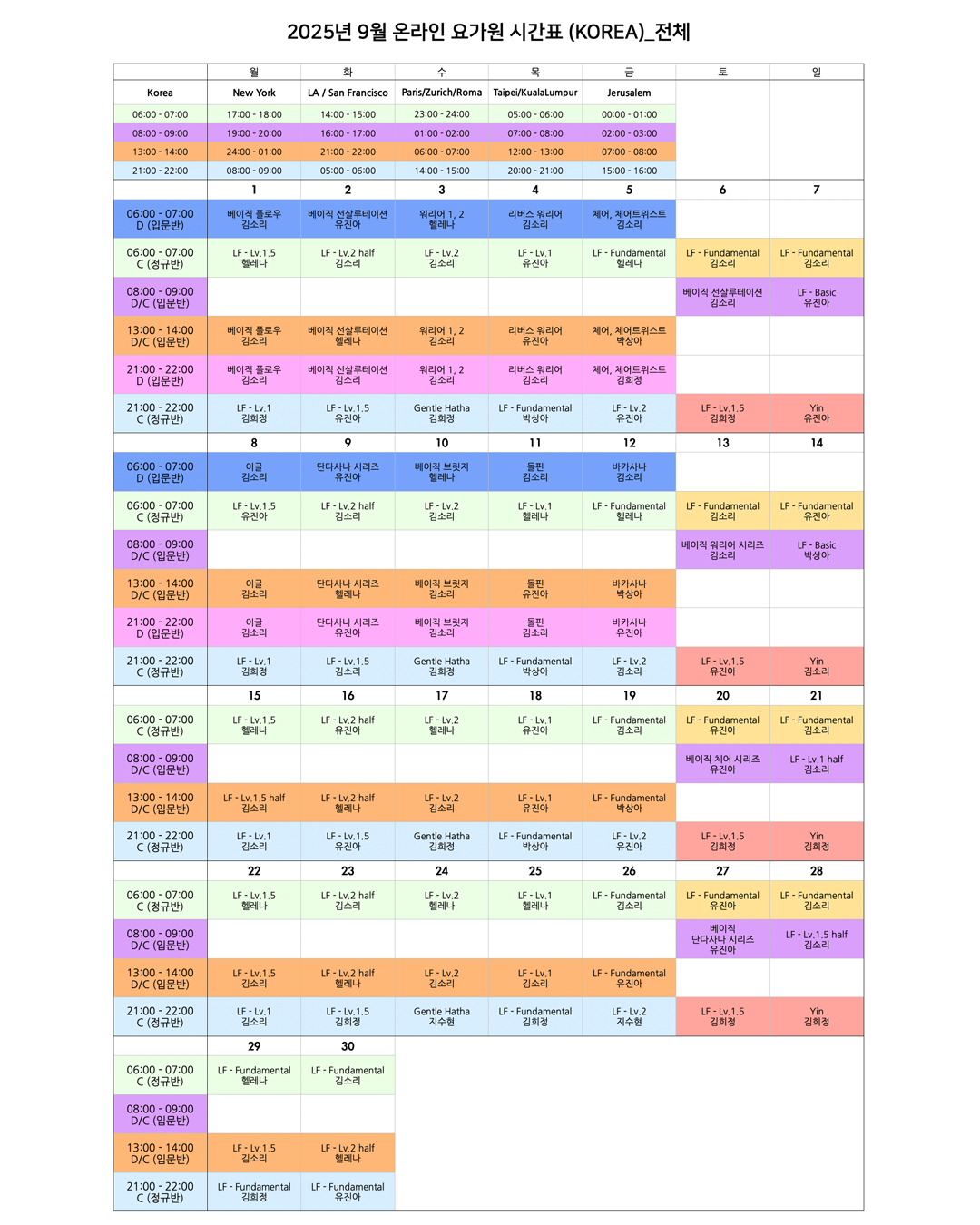 <9월 온라인 요가원 정규 클래스 수업 정보>